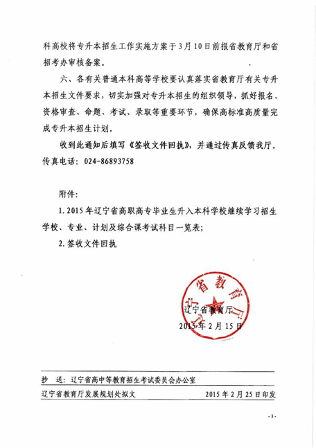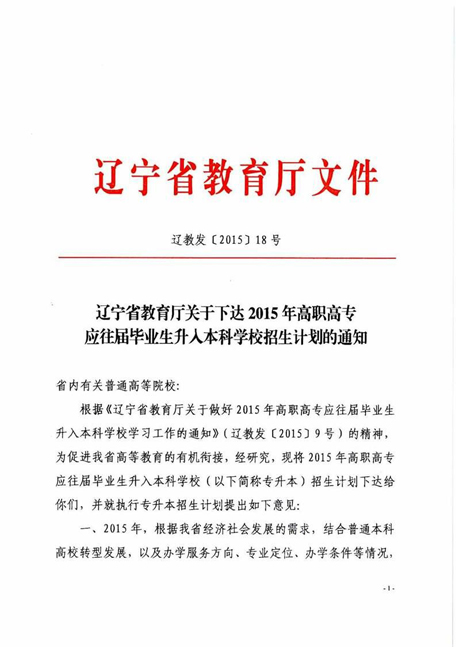 根据《辽宁省教育厅关于做好2015年高职高专应往届毕业生升入本科学校学习工作的通知》(辽教发[2015]9号)的精神,为促进我省高等教育的有机衔接,经研究,现将2015年高职高专应往届毕业生升入本科学校(以下简称专升本)招生计划下达给你们,并就执行专升本招生计划提出如下意见: