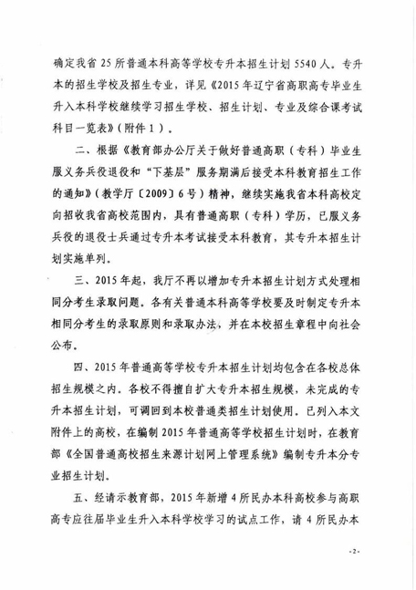 一、2015年,根据我省经济社会发展的需求,结合普通本科高校转型发展,以及办学服务方向、专业定位、办学条件等情况,确定我省25所普通本科高等学校专升本招生计划5540人。专升本的招生学校及招生专业,详见《2015年辽宁省高职高专毕业生升入本科学校继续学习招生学校、招生计划、专业及综合课考试科目一览表》(附件1)。