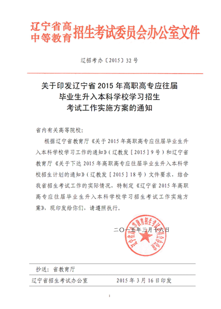 根据辽宁省教育厅《关于2015年高职高专应往届毕业生升入本科学校学习工作的通知》(辽教发[2015]9号)和辽宁省教育厅《关于下达2015年高职高专应往届毕业生升入本科学校招生计划的通知》(辽教发[2015]18号)文件要求,结合我省招生考试工作的实际情况,特制定《辽宁省2015年高职高专应往届毕业生升入本科学校学习招生考试工作实施方案》,现印发给你们,请遵照执行。