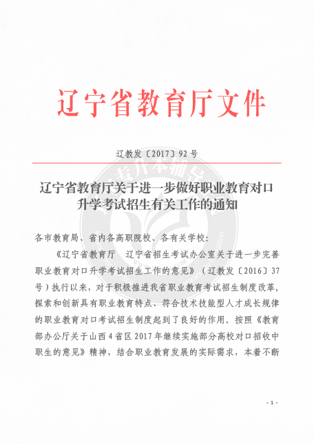 《辽宁省教育厅 辽宁省招生考试办公室关于进一步完善职业教育对口升学考试招生工作的意见》(辽教发〔2016〕37号)执行以来,对于积极推进我省职业教育考试招生制度改革,探索和创新具有职业教育特点、符合技术技能型人才成长规律的职业教育对口考试招生制度起到了良好的作用。按照《教育部办公厅关于山西4 省区2017年继续实施部分高校对口招收中职生的意见》精神,结合职业教育发展的实际需求,本着不断规范、逐步完善、合理布局,稳步推进的原则,现就进一步做好职业教育对口升学考试招生有关工作通知如下: