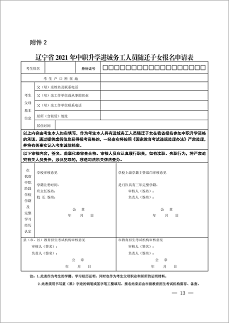 2.辽宁省2021年中职升学进城务工人员随迁子女报名申请表