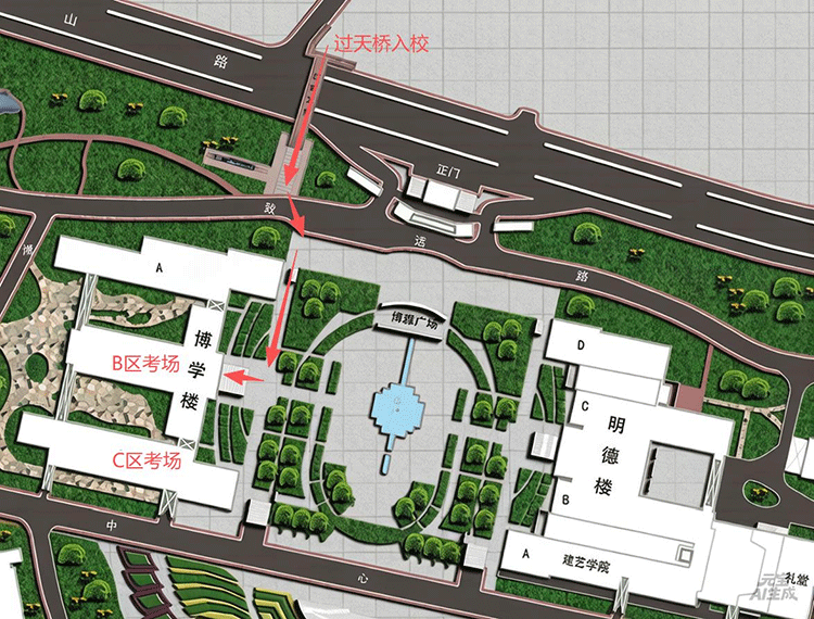 考生一律从科大天桥入校,携带本人准考证和二代身份证原件,在校门口接受身份验证后方可入校;考生需通过安检门进入考试楼,请提前做好准备。