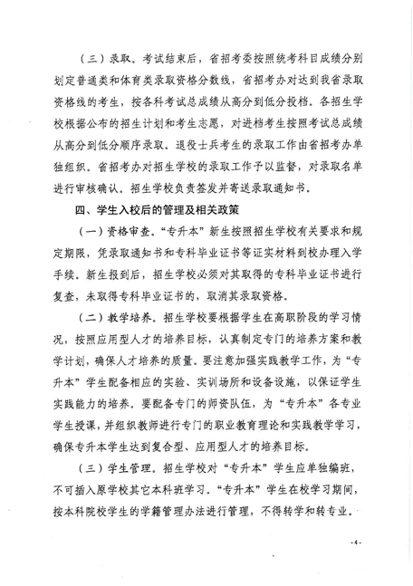 3、根据《教育部办公厅关于做好普通高职(专科)毕业生服义务兵役退役和“下基层”服务期满后接受本科教育招生工作的通知》(教学厅〔2009〕6号)和《教育部办公厅关于进一步做好高校学生参军入伍工作的通知》(教学厅〔2015〕3号)精神,继续实施我省本科高校定向招收我省高校范围内,具有普通高职(专科)学历,已服义务兵役的退役士兵通过专升本考试接受本科教育,其招生计划实施单列。